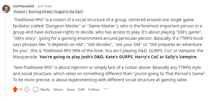 I wanted to show you, that judging non-traditionality of a given game is more about exceptionalism, less about puting things into brackets. It’s about how far you can go out from the most popular design choices. OSR and Forge-related TTRPGs can be equally distant from Traditional RPG, while being set apart from each other…