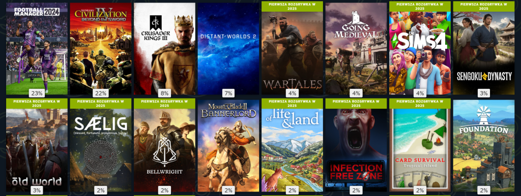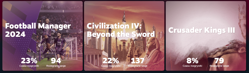 Z innych gier niż FM2024, Civ4 oraz CK 3, najwięcej czasu spędziłem w Distant Worlds 2 oraz Wartales. Jestem trochę zaskoczony ostatnim tytułem na 5. miejscu. Owszem, trochę w niego grałem, lecz wyłącznie w marcu. Chyba o te zaledwie parę godzin musiał wygrać z Going Medieval czy The Sims 4 chociażby. Natomiast DW 2 to wersja „o wiele bardziej złożone Stellaris”, czyli nic dziwnego z tym rezultatem na 4. miejscu Dla porównania, Stellaris miało ledwo 1% mojego udziału w gamingu…